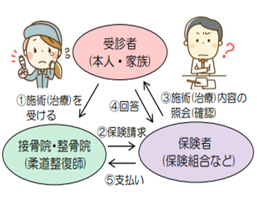 患者(受診者)の方が接骨院で 健康保険の対象になる施術を受けた場合に、接骨院( 柔道整復師)は、各保険組合に対して保険適用分の 請求手続きをします。その際に、負担分を支払う保険組合側が