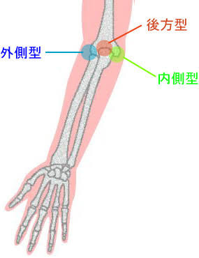 後方型になる方、は肘の後にあたる肘頭に痛みが出ます。
