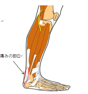 かかとからアキレス腱5cmくらいの部分が腫れ、押さえると痛みが増強します。