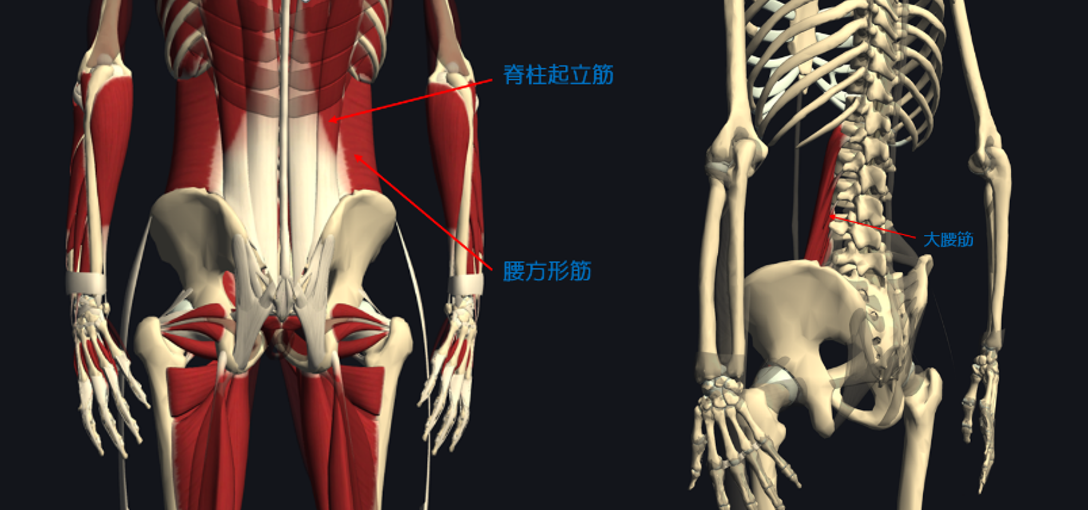 腰の周りには大きな筋肉(腰方形筋・大腰筋・脊柱起立筋など)が多数存在していて、事故による衝撃でそれらの筋肉に一度に多く傷がつくと、腰周り全体の筋肉の緊張感が強くなります。