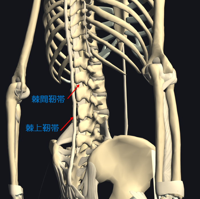 背中から腰にかけての棘間靭帯は隣り合う上下の棘突起を結ぶ薄い膜性の靱帯、棘上靭帯は第7頚椎から仙骨までの棘突起先端間を結ぶ強い線維索で、これらの靭帯が事故により部分断裂や腫れを引き起こします。