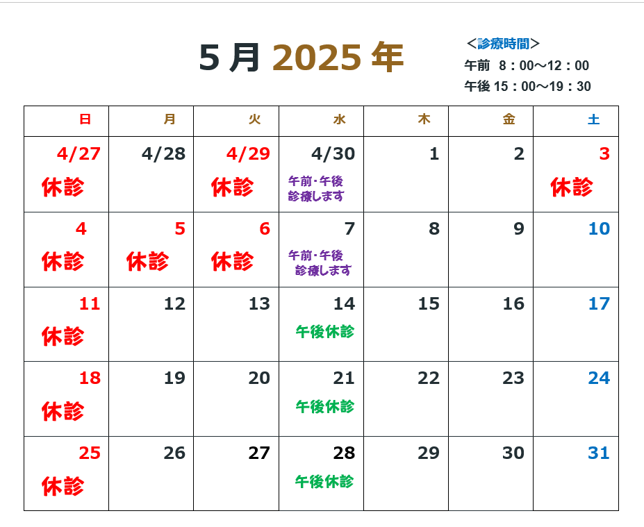 | 午後 | ● | ● | × | ● | ● | ● | × |