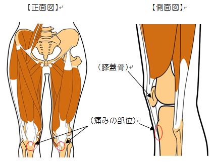 膝の膝蓋骨(お皿)から数センチ下の部分が痛くなり、脹れる症状です。