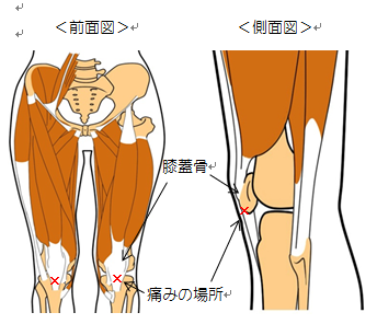 膝蓋骨(お皿)の下部が痛くなる症状です。太ももの筋肉は、膝蓋骨を通過して、スネの骨の上部に停止しています。