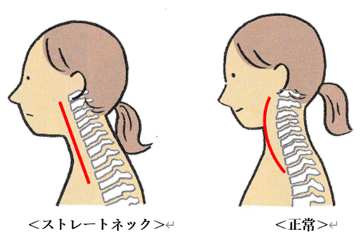 ストレートネックとは、首の骨の並び方が本来30〜40度の「自然なカーブ」を描いているのに対し、首の骨の並び方が「ストレート」になっている状態をいいます。(図参照)