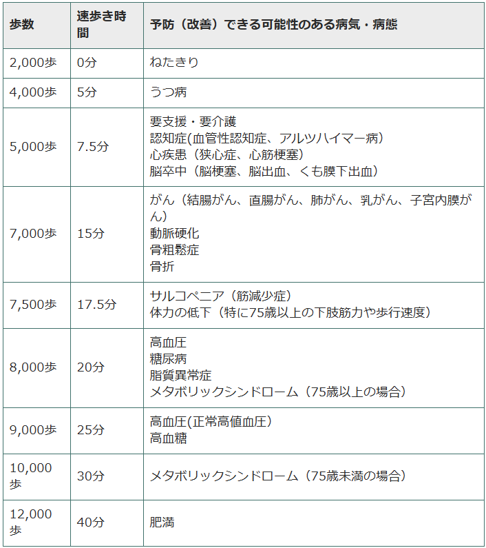 健康寿命を延ばすこと、社会生活に必要な機能向上を図ること、生活習慣病予防を徹底することなど、国民の健康の増進の総合的な推進を図るための基本的方針を示した健康日本21では、一日の歩数目標値として20~64歳までは男性9,000歩、女性8,500歩、65歳以上では男性7,000歩、女性6,000歩が掲げられています。