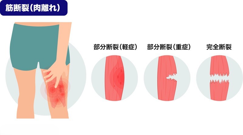 肉離れは、部分的に損傷していて歩行可能なものから、筋肉が完全に断裂してしまい体重をかけることも出来ないものまで、損傷の度合いによって症状は様々です。